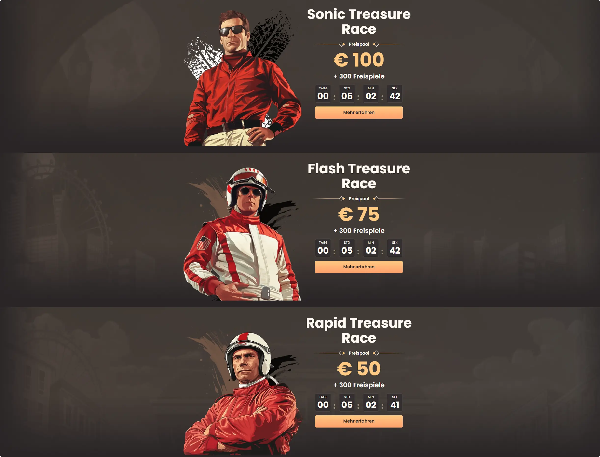 | Flash Treasure Race | 75 Euro + 300 Freispiele |